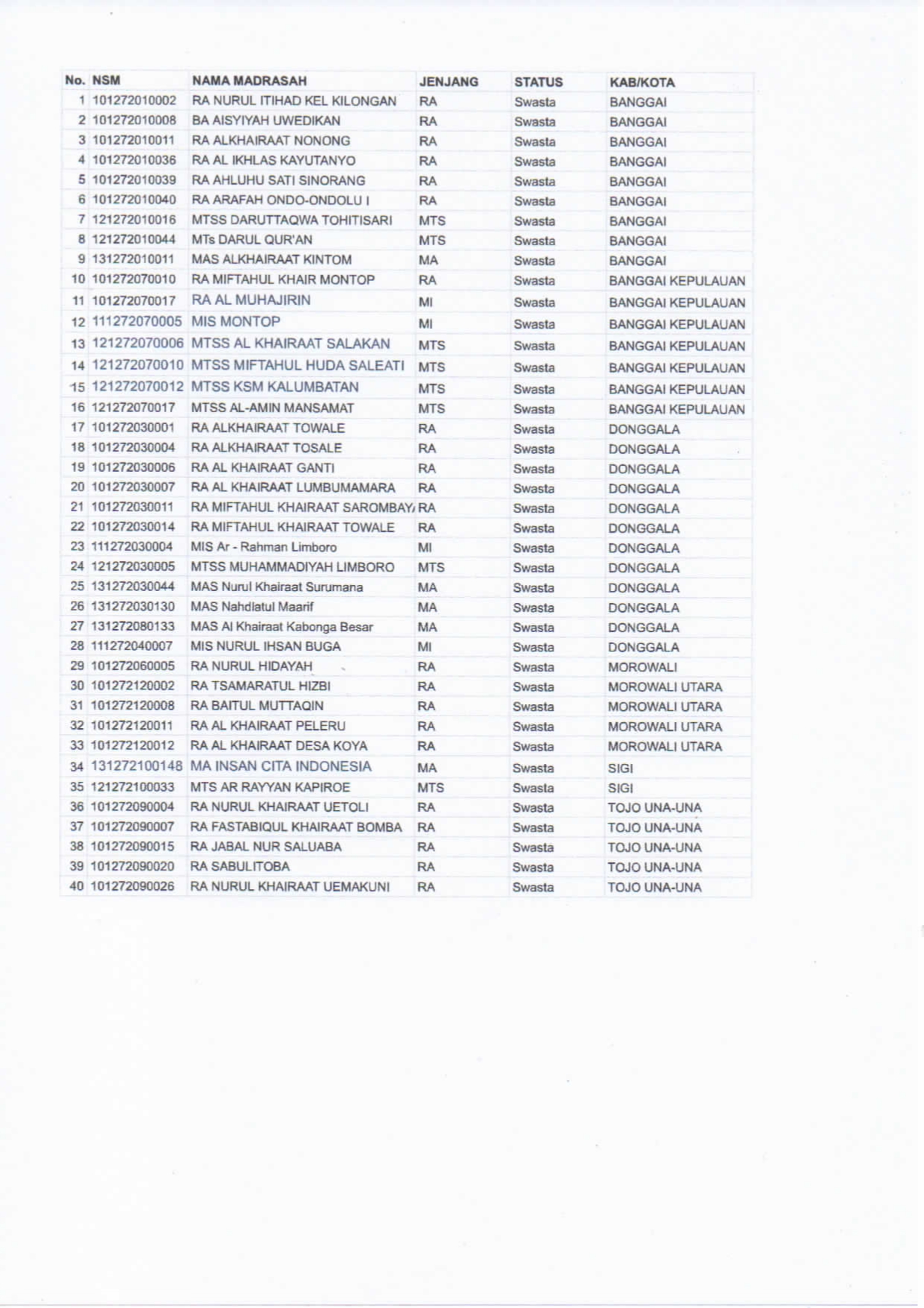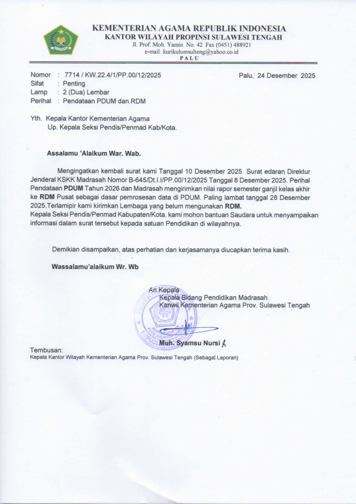 Surat Kepala Kantor Wilayah Kmenterian Agama Sulawesi Tengah terkait Pendataan PDUM dan RDM